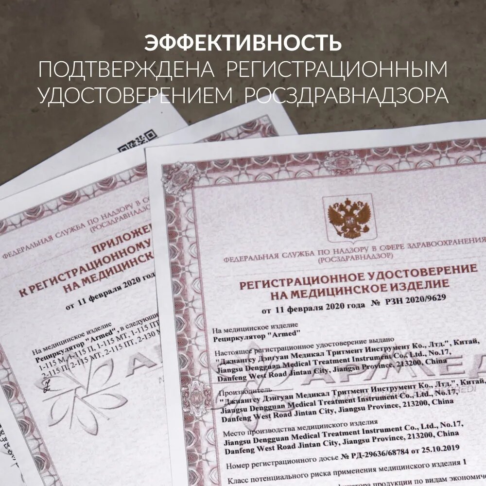 Облучатель-рециркулятор Армед является медицинским прибором и имеет регистрационное удостоверение. В результате ряда научных исследований НИИ Дезинфектологии Роспотребнадзора была доказана эффективность рециркуляторов Армед против бактериальных и вирусных инфекций. Устройства показали себя как надёжный способ обеззараживания воздуха различных помещений в профилактических целях, а также в комплексе противоэпидемиологических мероприятий.