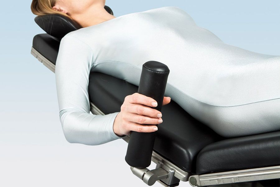 За эту удобную ручку с мягкой обивкой пациент может ухватиться в положении на спине. Для более удобного доступа к пациенту сбоку ручку можно сложить.